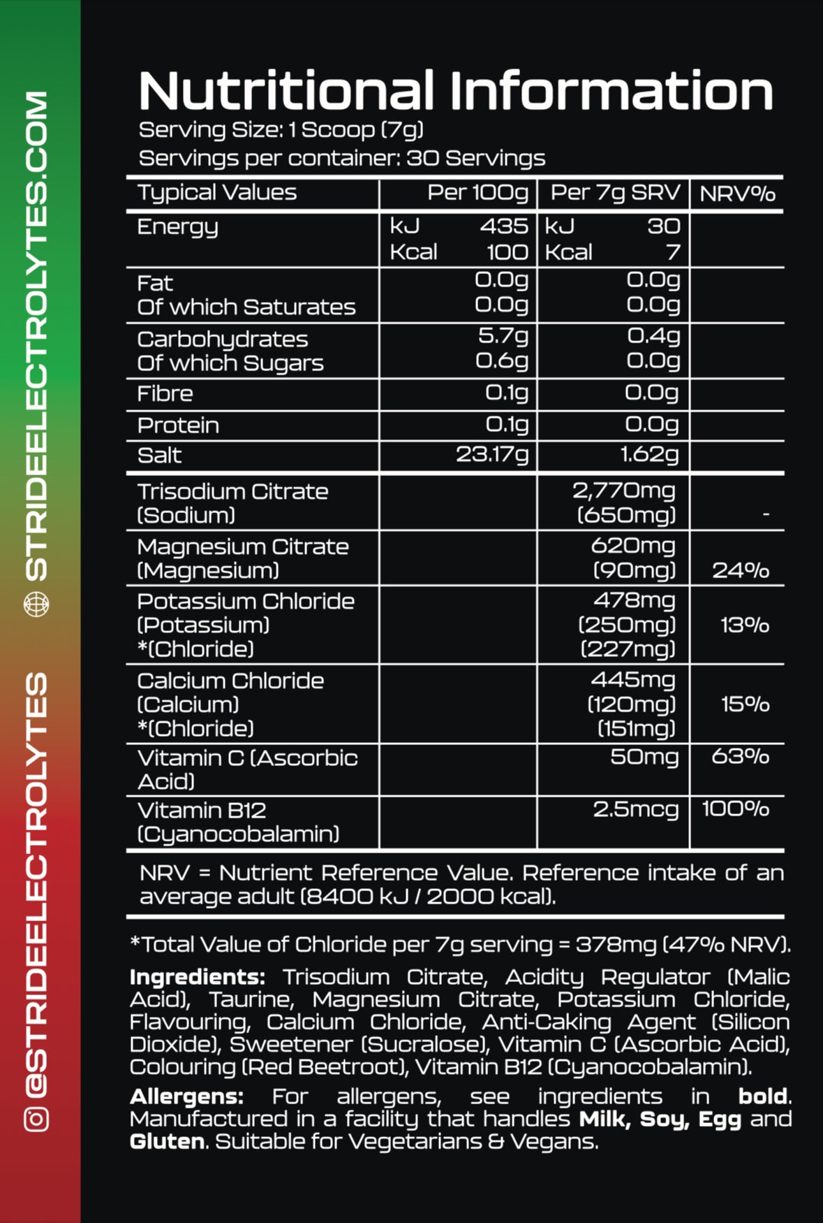 Trisodium Citrate, Acidity Regulator (Malic Acid), Taurine, Magnesium Citrate, Potassium Chloride, Flavouring, Calcium Chloride, Anti-Caking Agent (Silicon Dioxide), Sweetener (Sucralose), Colouring (Red Beetroot), Vitamin C (Ascorbic Acid), Vitamin B12 (Cyanocobalamin).